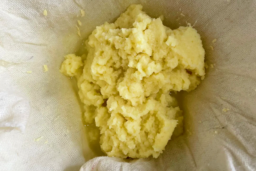 3、準備一個小奶鍋,上面放一塊乾淨的紗布,將薑汁倒入鍋中,紗布可以起到過濾的作用,過濾後,大家會看到紗布上殘留著一層厚厚的薑蓉,這時候可以戴上手套,用雙手用力擠壓,將裡面含有的薑汁都擠出來;